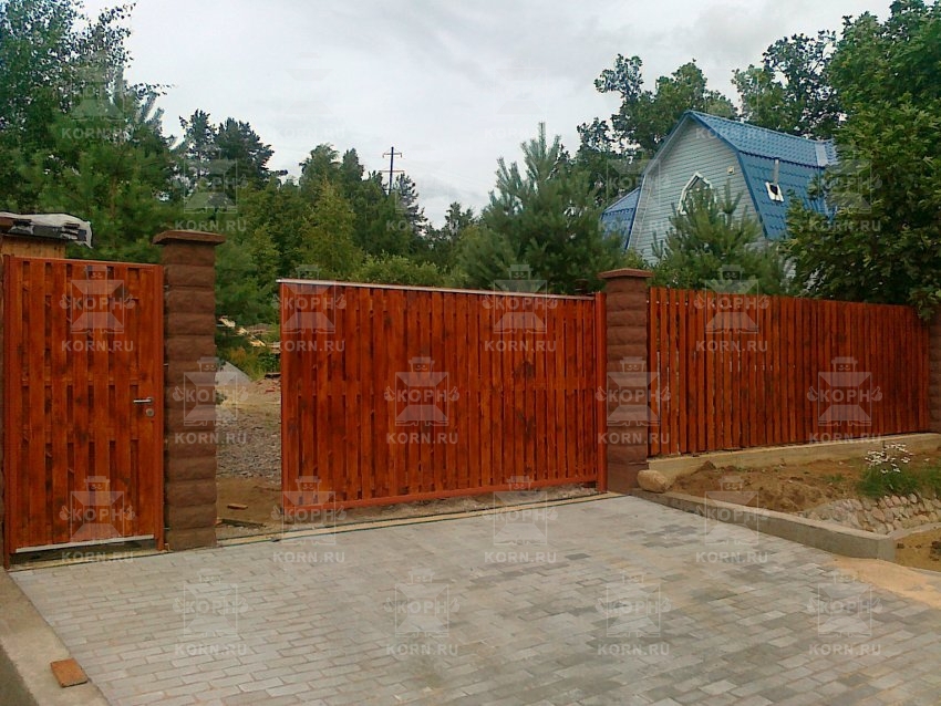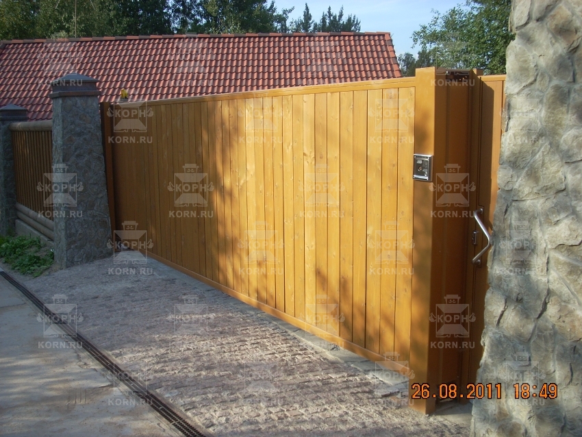 • Откатные ворота серии ЕВРО и калитка с зашивкой деревом Откатные ворота серии ЕВРО и калитка с зашивкой деревом